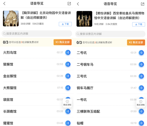 另外,为丰富多彩的人设,携程全球玩乐平台的语音导览功能,挖掘海量精心制作的语音内容,多种讲解风格,更有央视主播、演艺名人、播音演员等为携程提供风格迥异的语音讲解,满足游客的喜好和需求。例如,在北京,有鞠萍姐姐讲解北京动物园,在陕西,有赖怡老师讲解西安兵马俑等。