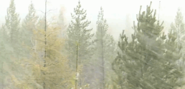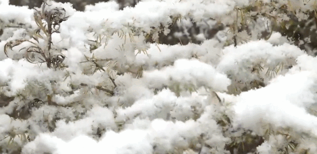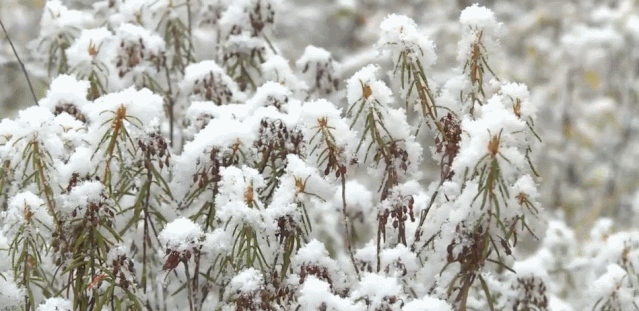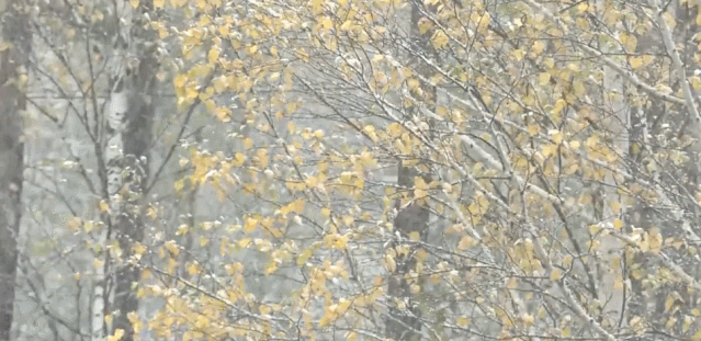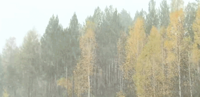 森林里秋意正浓飘飘洒洒的大雪让满山的金黄披上了雪白的新衣