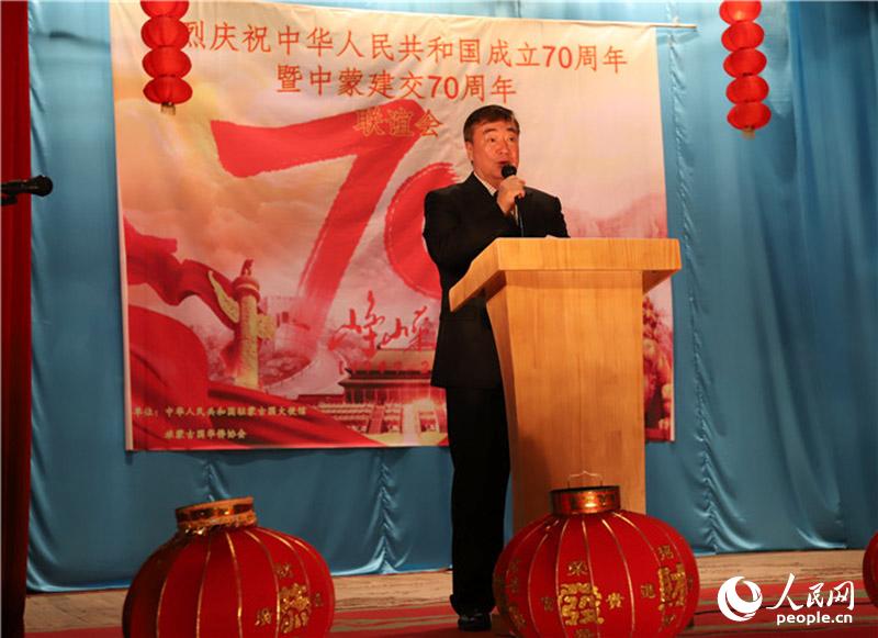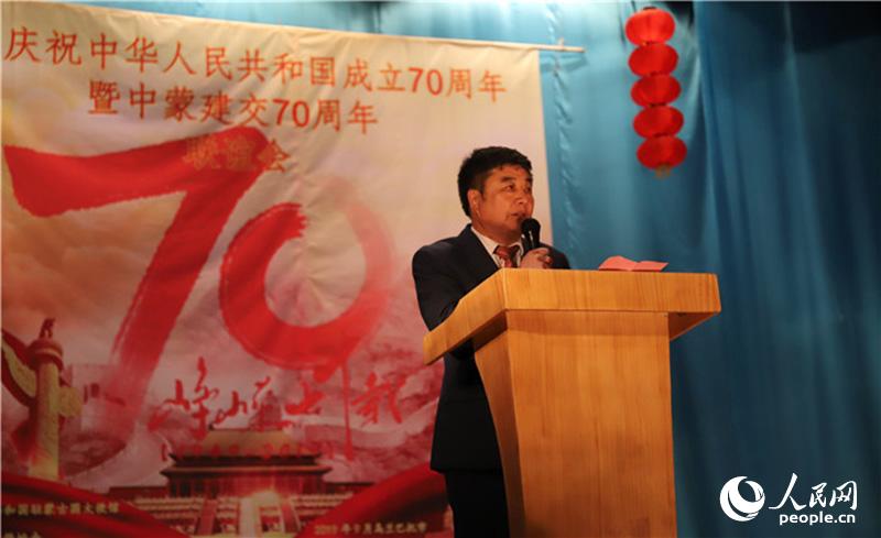 旅蒙华侨协会会长白双占祝福伟大祖国70岁生日快乐并感谢中国大使馆为广大华侨提供的支持和帮助,他表示,广大旅蒙华侨华人为伟大祖国日新月异的变化感到自豪。有国才有家,身在异国他乡的炎黄子孙为祖国取得的巨大发展感到骄傲。广大旅蒙华人华侨将积极发挥自身力量,为祖国发展建设贡献力量,在海外展示新时代中国人的良好形象。
