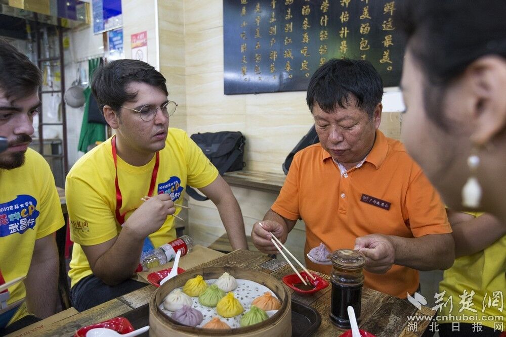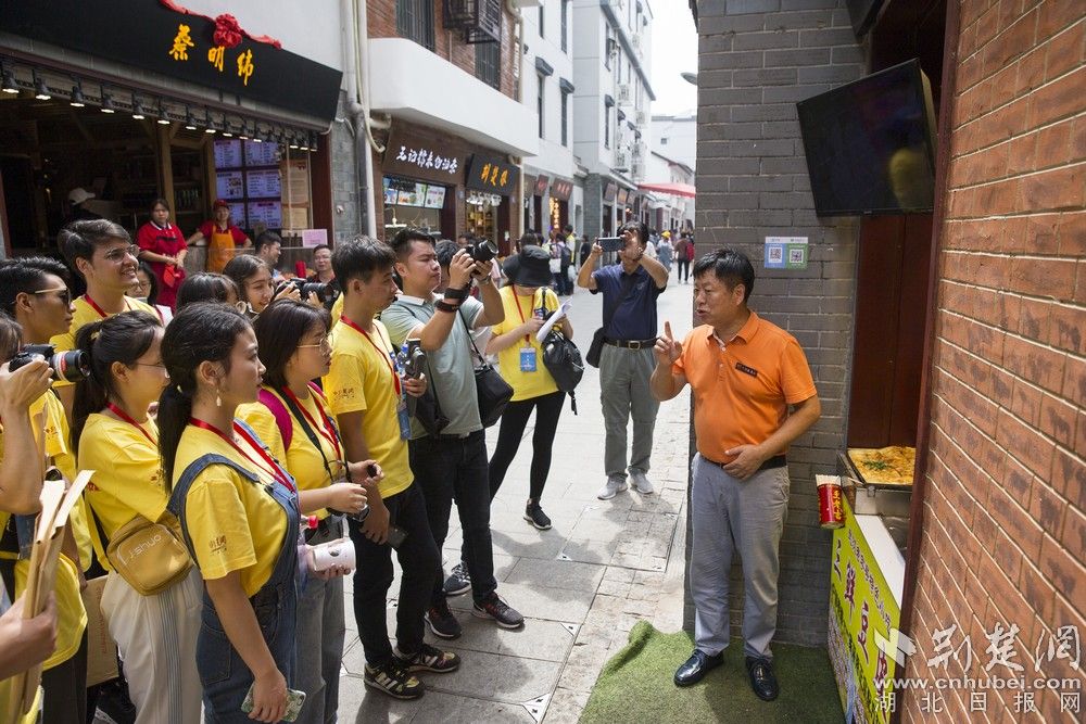 活动当天,从豆皮、到糯米包油条;从武大樱花饼到叶老瘪黄牛肉饼;从鸭脖子再到五色汤包……大学生花样组合团跟着户部巷程会长品尝一道接一道的特色汉味美食,听取一段段汉味小吃背后的文化和故事。
