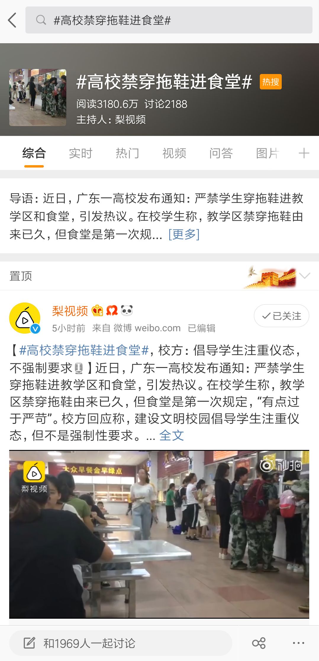 近日,一条#高校禁止穿拖鞋进食堂#的热搜引起了人们对“该不该穿拖鞋进食堂”的讨论