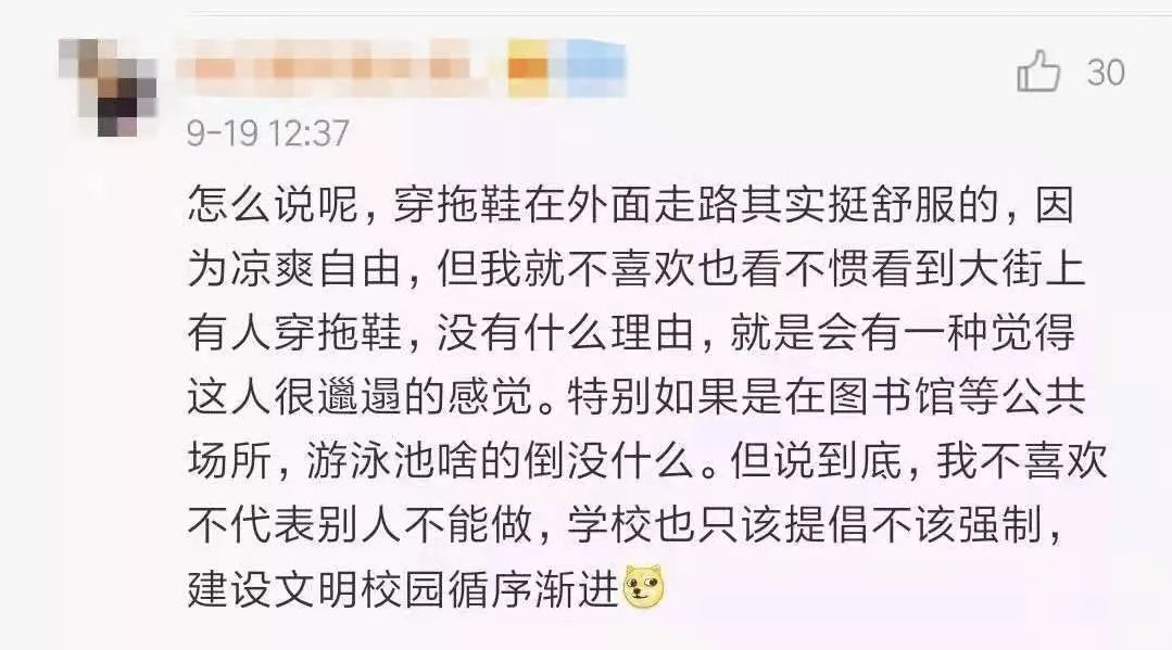 那么,禁止穿拖鞋去食堂究竟是干涉了学生的自由还是在提醒学生注重自身形象呢?你怎么看?