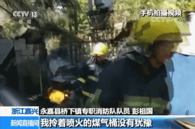 危机时刻,消防员彭祖国拎起燃烧中的煤气罐便往外跑。