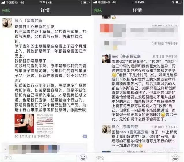 奈雪の茶创始人彭心在朋友圈发出长文,直指喜茶抄袭而没有创新,聂云宸则回击对方不懂“抄袭”与“创新”的差异。