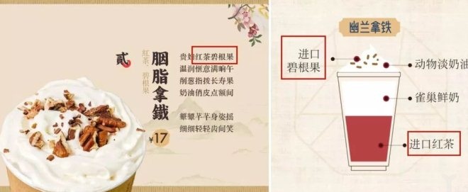 甚至连选用的原料也都相似:幽兰拿铁是红茶+碧根果,胭脂拿铁也是红茶+碧根果。