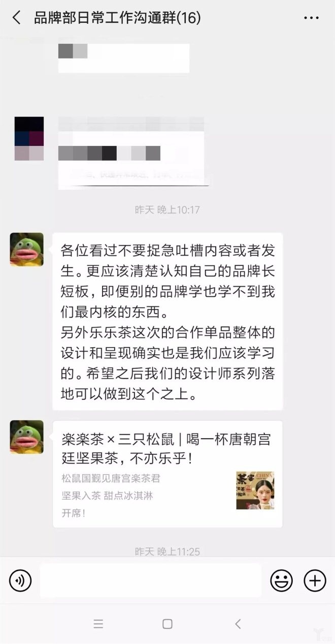 是其品牌部在内部群里发的消息:各位看过不要捉急吐槽内容或者发生(声)。更应该清楚认知自己品牌长短板,即便别的品牌学也学不到我们最内核的东西。另外乐乐茶这次的合作单品整体的设计和呈现确实也是我们应该学习的。希望之后我们的设计师系列落地可以做到这个之上。