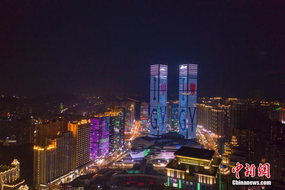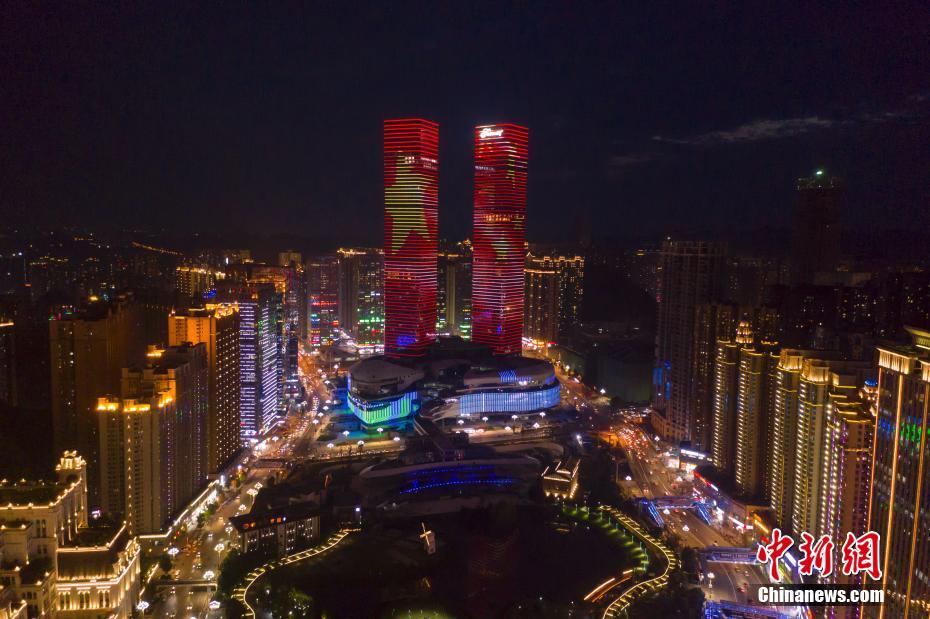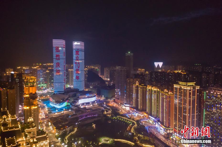 9月24日,贵阳市花果园双子塔上演庆祝中华人民共和国成立70周年灯光秀,吸引市民驻足拍照留念。图为航拍贵阳市花果园双子塔灯光秀。中新社记者 贺俊怡 摄