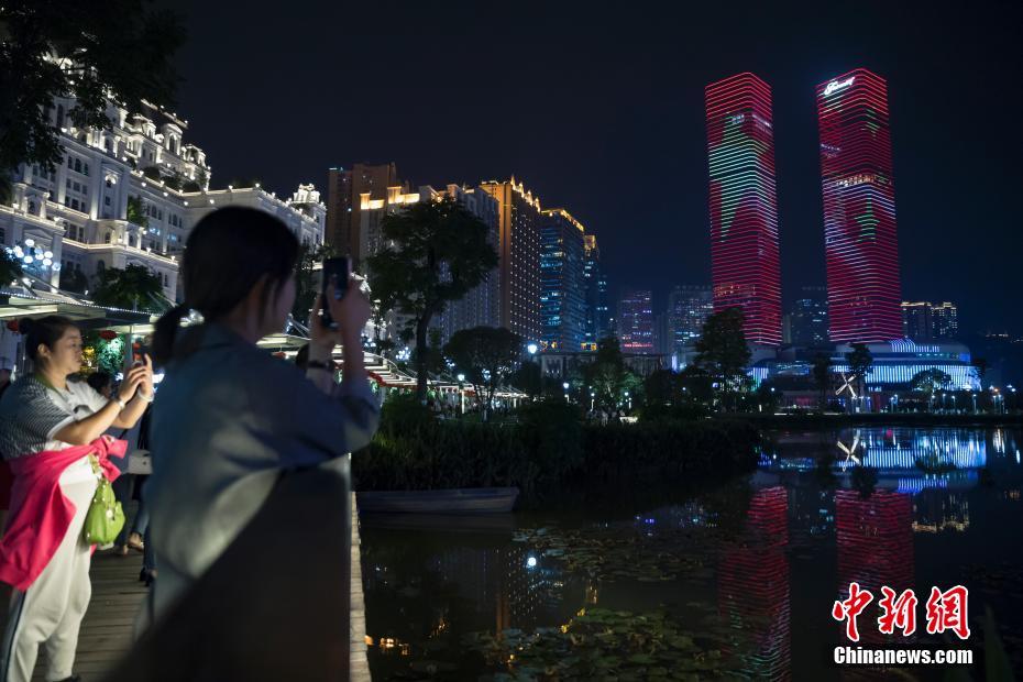 9月24日,贵阳市花果园双子塔上演庆祝中华人民共和国成立70周年灯光秀,吸引市民驻足拍照留念。中新社记者 贺俊怡 摄