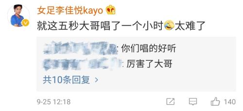 不过,评论中有一个人有些“搞笑”——女足队员李佳悦自曝,五秒的歌词自己唱了一个小时,太难了。