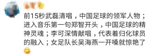 男足队员郑智、武磊领唱,归化球员李可中文开腔全情投入;女足队长吴海燕嗓音动听,王霜也透过镜头一展歌喉。视频中,还剪辑了不少男、女足国家队的“名场面”,看得人心潮澎湃。