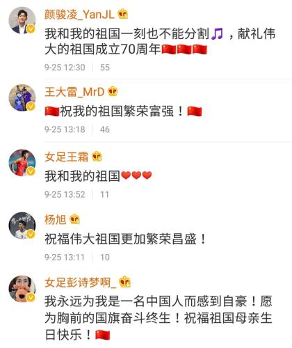 视频发出后,不少国脚纷纷转发、评论,表达对于新中国成立70周年的祝福。