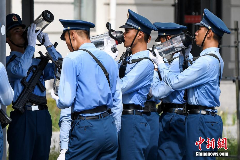 - 近日,中新社记者探访了位于北京市郊的国庆阅兵训练场,了解国庆阅兵的相关组织与训练情况。图为官兵们在阅兵训练间歇补充水分。中新社记者 崔楠 摄