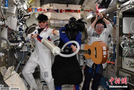 资料图:2018年11月2日讯,国际空间站的ESA德国宇航员Alexander Gerst在周三发推传回国际空间站的万圣节问候,在图片上三位国际空间站船员打扮成太空猫王、星战黑武士达斯·维达、疯子科学家,配文“在太空度过了惊悚一日,国际空间站船员祝大家万圣节快乐”。