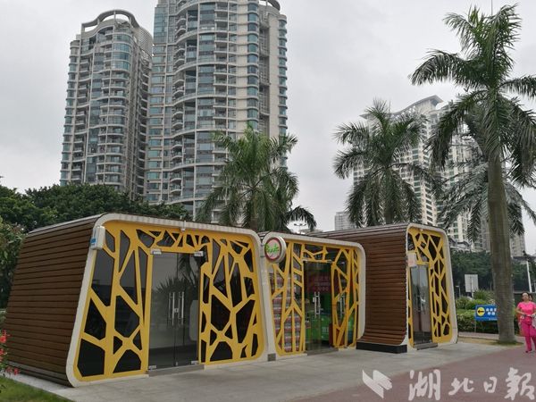 湖北华杰智能环卫设备有限公司研发的3D打印厕所,3个多小时内即可组装完成。图为珠海街头的该产品实景图。