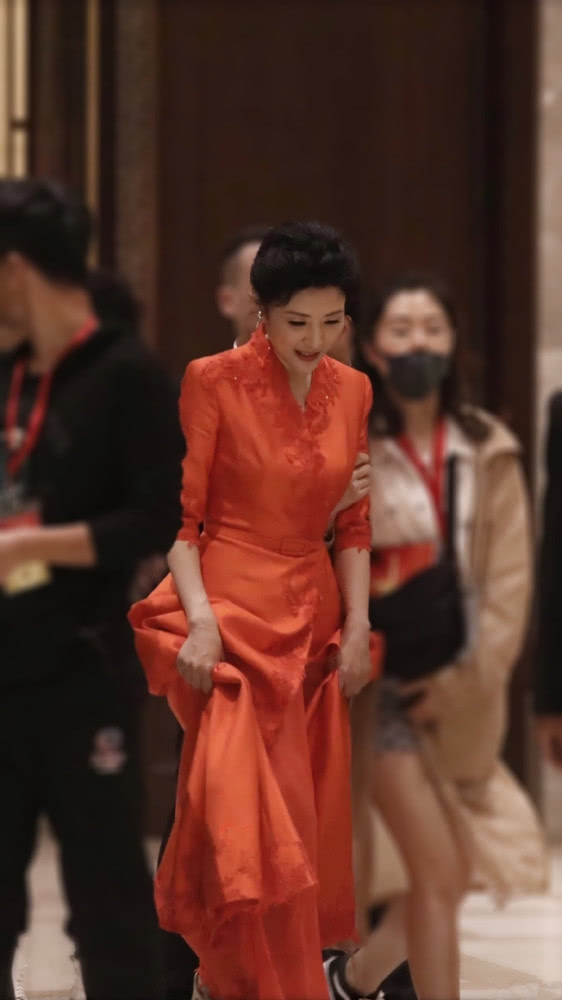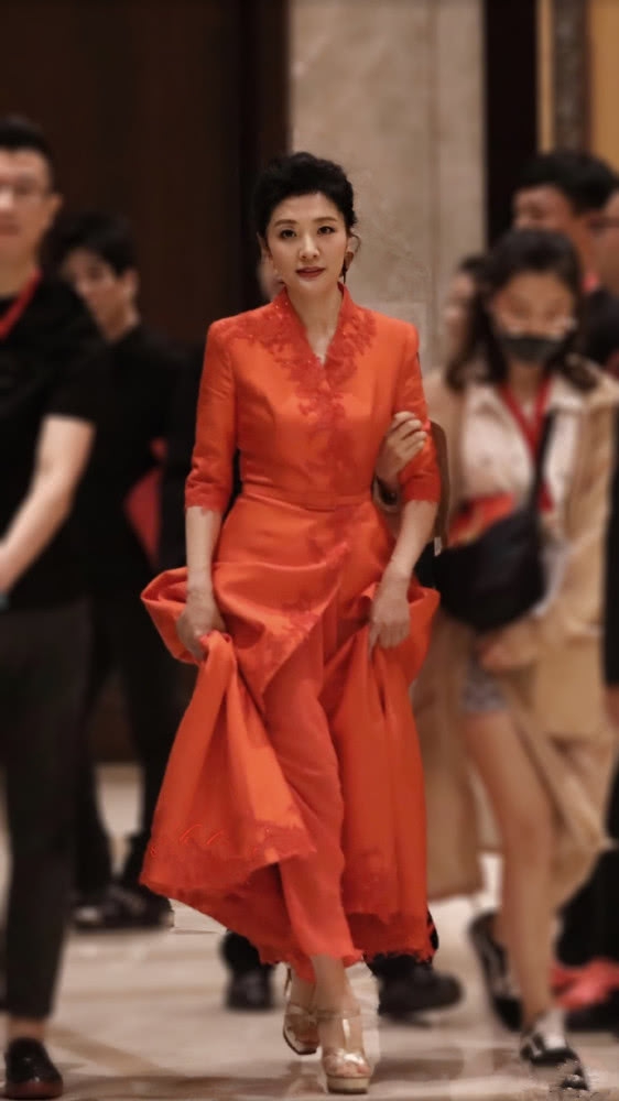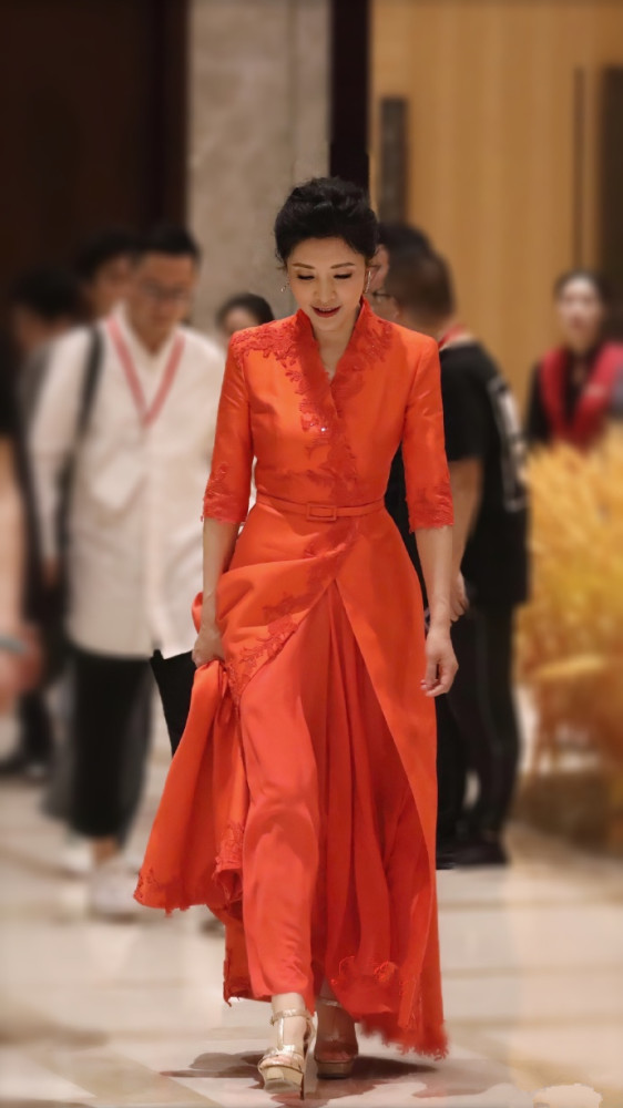 9月29日,有网友晒出一组周涛主持某晚会的照片。她穿着一袭中国红长裙,走起路来裙摆在身边飘荡尽显优雅气质。将头发高高盘起来,露出天鹅颈,一颦一笑一举一动显露一姐风范。