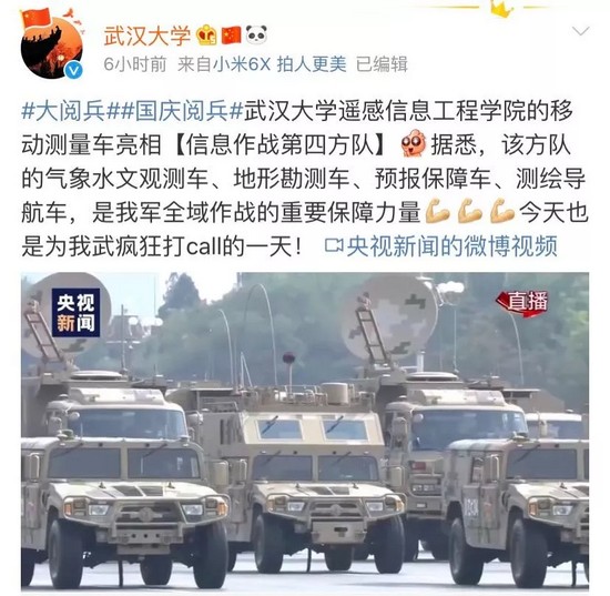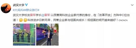 武汉大学校友雷军以民营高科技企业家代表的身份在「改革开放」方阵中C位出道