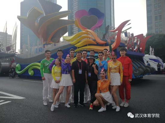武汉体育学院艺术学院13名学生画着“楚风”妆容活力四射地站在湖北彩车上向世界展现时尚炫动的新湖北