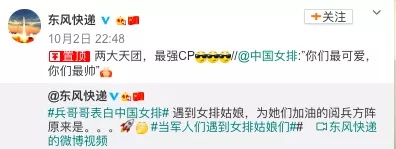 女排队员与兵哥哥的互夸让人动容。