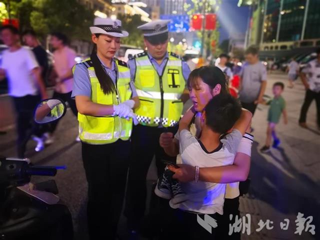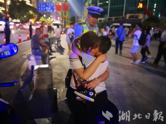 2日傍晚,一位好心群众牵着一个打赤脚与家人走散的小男孩到江岸区沿江大道汉口江滩一号门前,向值守灯光秀安保工作的江岸交警求助,江岸区交通大队一中队执勤民警彭华、苗婷连忙将走失小男孩抱放至警用摩托车上临时休息,一边安抚一边耐心询问,小男孩及时报出了家人电话号码,民警赶紧拿出手机打电话联系其母亲,10分钟后,孩子的妈妈拎着鞋子急冲冲跑来,抱着失而复得的儿子痛哭。据孩子母亲说他们来自河南漯河,晚上带着6岁的儿子到武汉汉口江滩游玩,因人太多,一不小心和儿子走散了,正心急如焚四处寻找时接到了武汉警察的电话。母子俩离开再三致谢,感谢江岸交警辛苦值守与保卫。