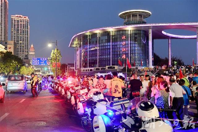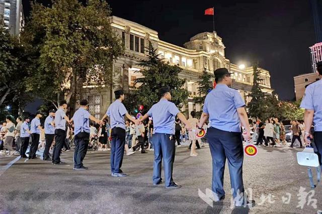 湖北日报讯(通讯员 唐时杰、王美慧)10月2日晚上,武汉汉口江滩大门广场前,民警手牵手组成“人墙”疏导、护卫人流横穿马路。2019年国庆长假期间,武汉市长江两岸灯光秀吸引了五湖四海群众的目光,市民、游客纷纷涌向汉口江滩一览盛景。据不完全统计,仅10月1日、2日晚上,汉口江滩游览观赏的人数就超过50万人次。
