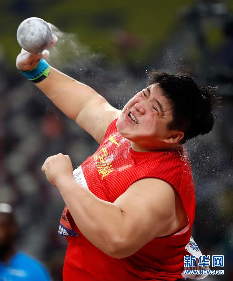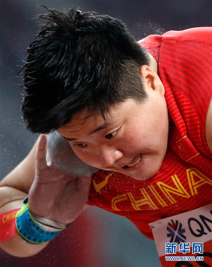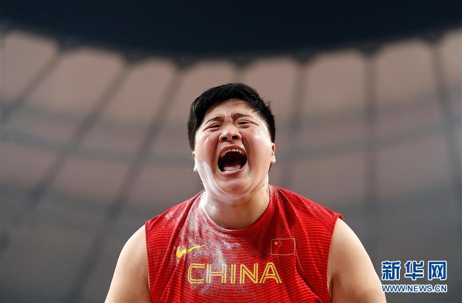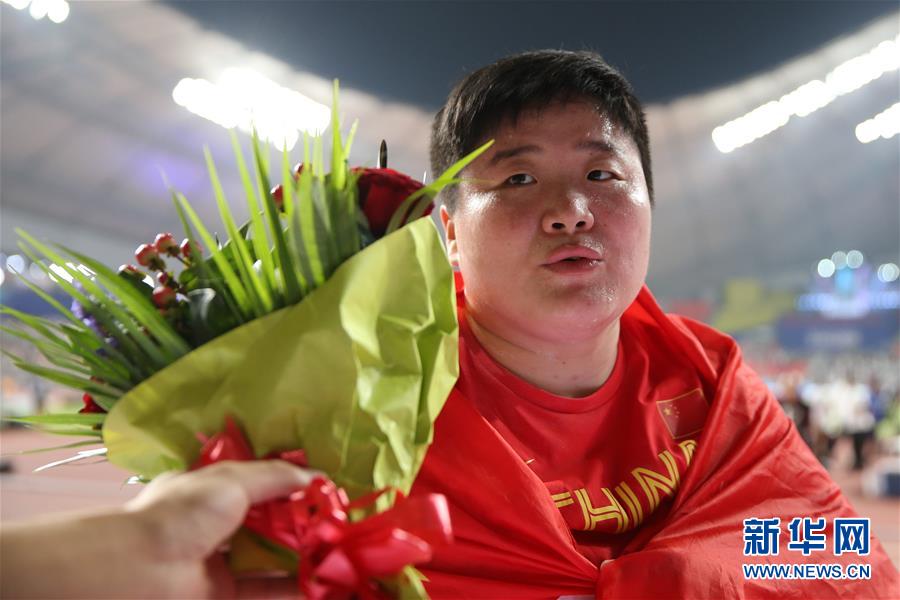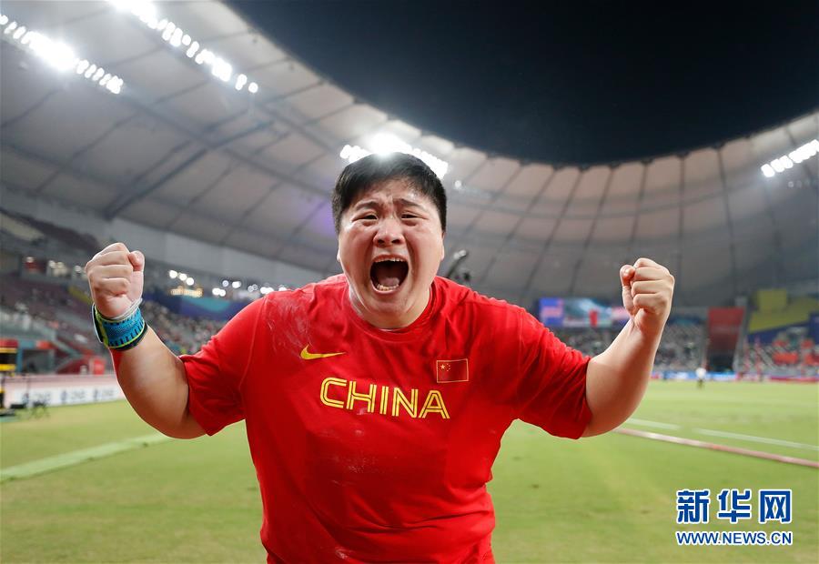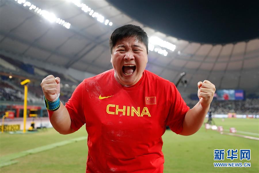 当日,在卡塔尔多哈举行的2019国际田联世界田径锦标赛女子铅球决赛中,卫冕冠军、中国选手巩立姣以19米55的成绩夺得冠军。 新华社记者王婧嫱摄