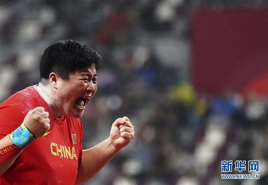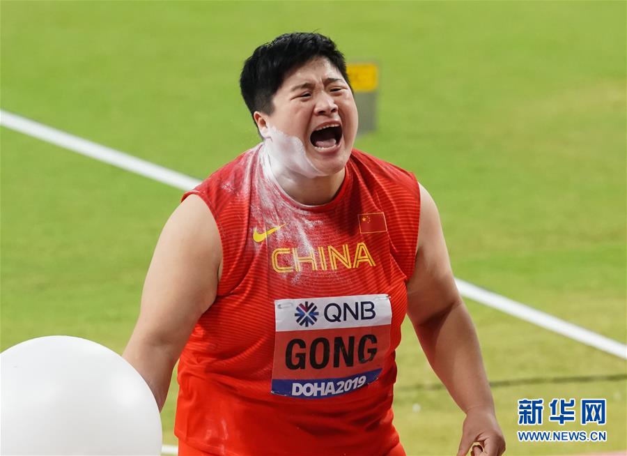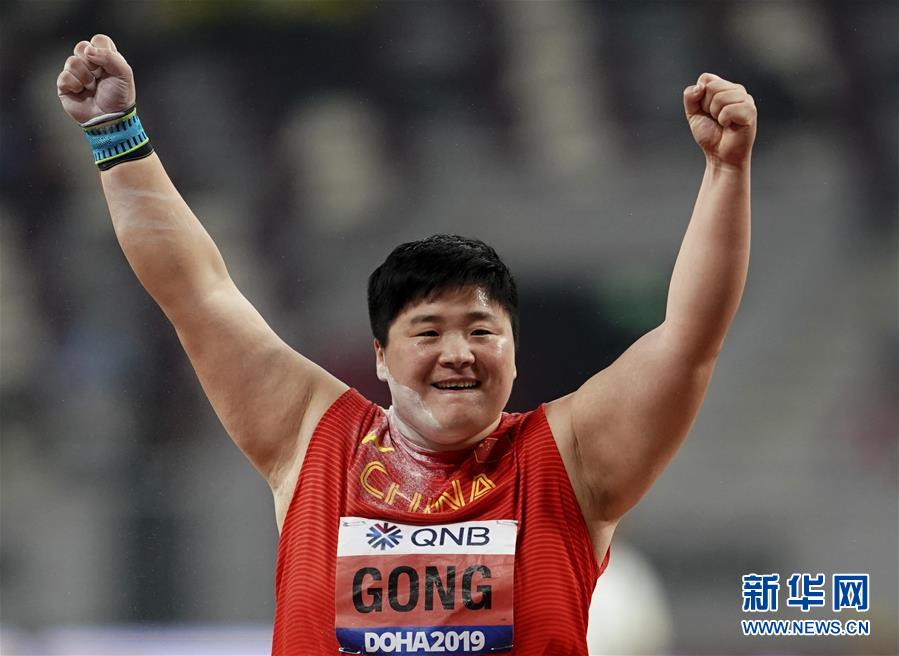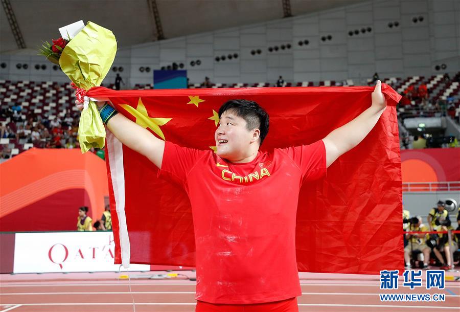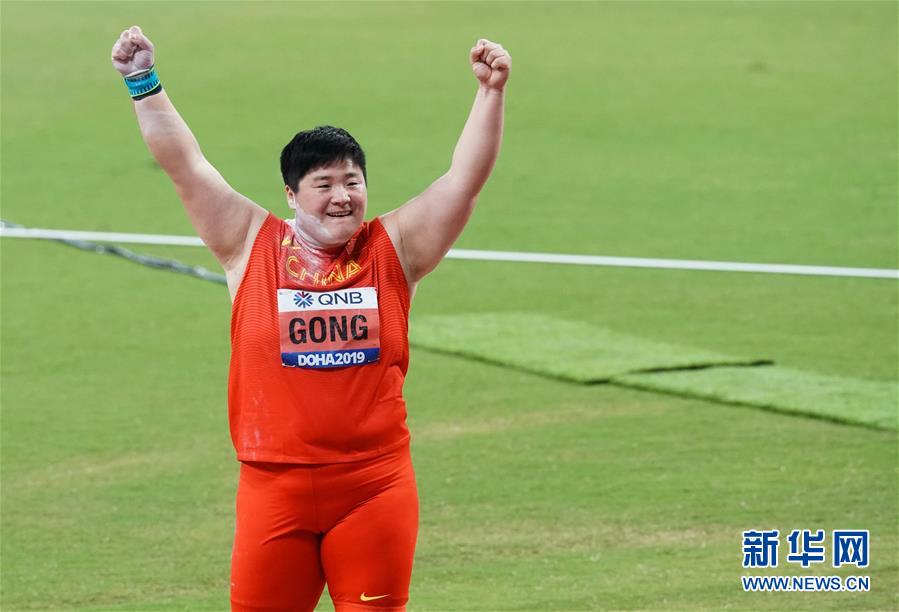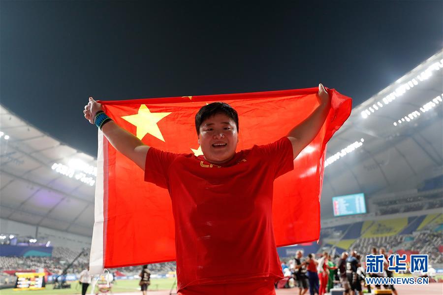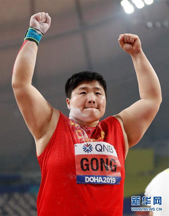 当日,在卡塔尔多哈举行的2019国际田联世界田径锦标赛女子铅球决赛中,卫冕冠军、中国选手巩立姣以19米55的成绩夺得冠军。 新华社记者李明摄