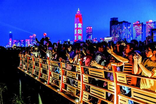 图为游客在汉口江滩争睹璀璨灯光秀楚天都市报记者宋枕涛摄
