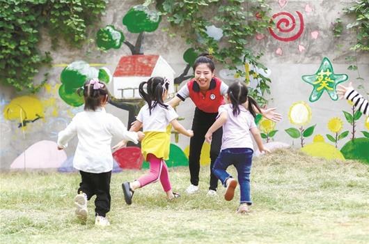 图为:和孩子们开心玩耍