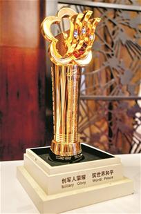 图为:军运会奖杯名为“腾飞”,以梅花、抽象的和平鸽为设计主元素。军运会奖牌名为“和平友谊之星”,融入了五角星、长城、梅花、黄鹤楼等视觉元素。 楚天都市报记者邹斌摄