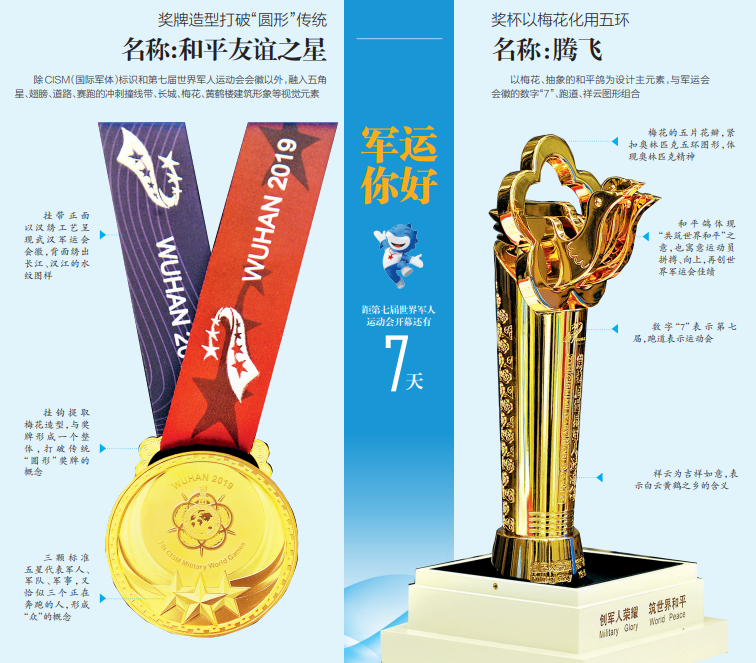 奖牌外围采用长城的图聚纹样,反映出中国文化源远流长。军运会奖杯名为“腾飞”,以梅花、抽象的和平鸽为设计主元素,与军运会会徽的数字“7”、跑道、祥云图形组合构成。一飞冲天的和平鸽造型,既体现“共筑世界和平”之意,也寓意运动员拼搏、向上,再创世界军运会佳绩。数字“7”表示第七届,跑道表示运动会,祥云为吉祥如意,也表示白云黄鹤之乡的含意。梅花的五片花瓣,紧扣奥林匹克五环图形,体现“更快、更高、更强”的奥林匹克精神。