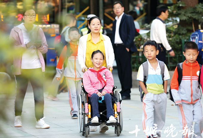 妈妈每天早上准时推着王锦怡来到校园,上学是她最开心的事情。