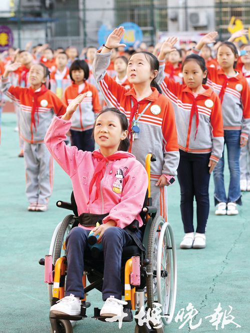 周一升国旗活动如期举行, 操场上王锦怡熟练地推着轮椅和班上同学列队站好,当五星红旗缓缓升起时,她坐在轮椅上边敬礼边唱着国歌,注视五星红旗冉冉升起。升国旗活动结束后,王锦怡的妈妈快速抱着她来到三楼教室最后一排上课坐的轮椅上,并帮她放好专门配置的一张课桌,一天的学习生活正式开始了……