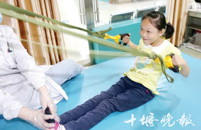 每天下午3点,在学校附近的市友好医院康复科,王锦怡都要在家长的陪同下进行针灸理疗和牵引等康复治疗和训练。9月23日下午,在做牵引等运动练习时,她那细小的双手用力一个回合一个回合坚持做着,旁边的爸爸心疼地说:“孩子,累了你就休息吧!”