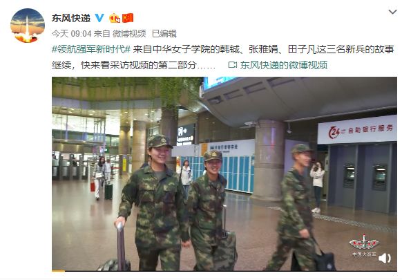 据中国人民解放军火箭军官方微博@东风快递 消息,火箭军某部新兵营正迎来3名气质俱佳的女新兵,她们是来自中华女子学院的韩铖、张雅娟、田子凡。