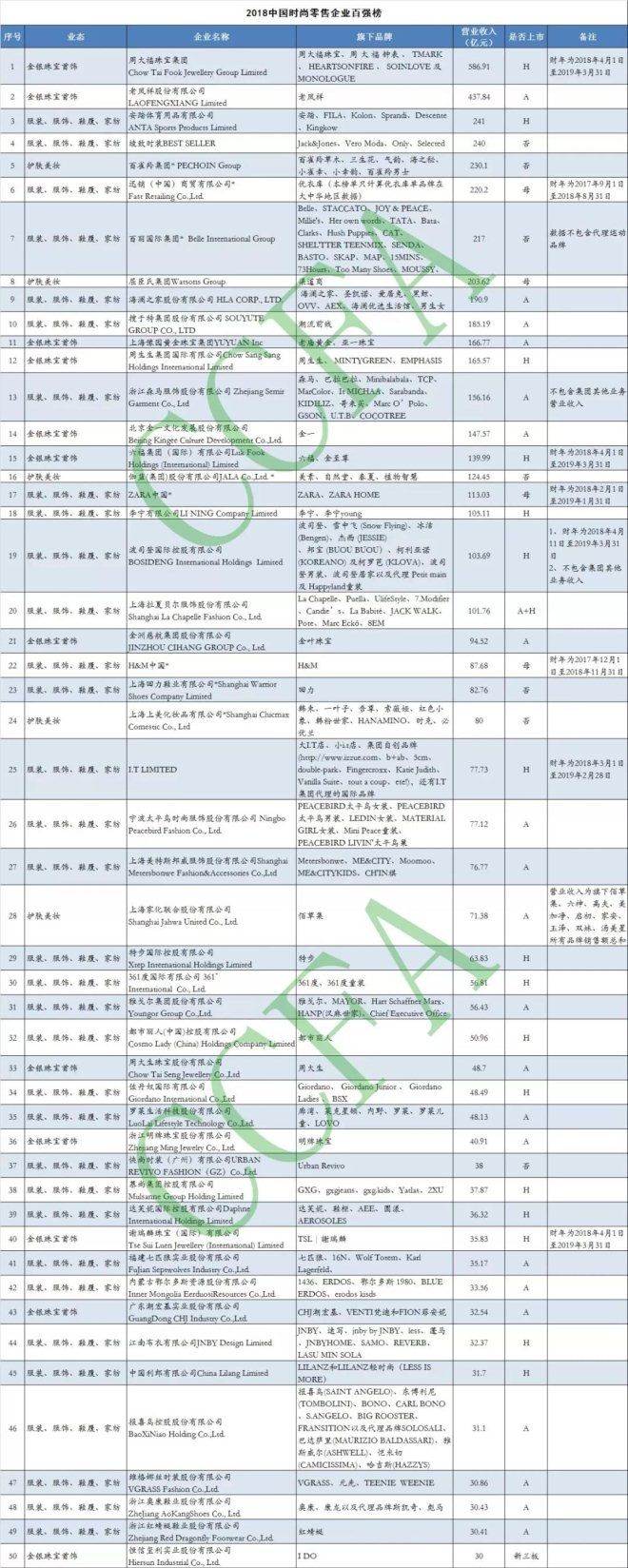 2018时尚零售百强企业,各个品类的企业都发力三四线市场。