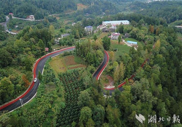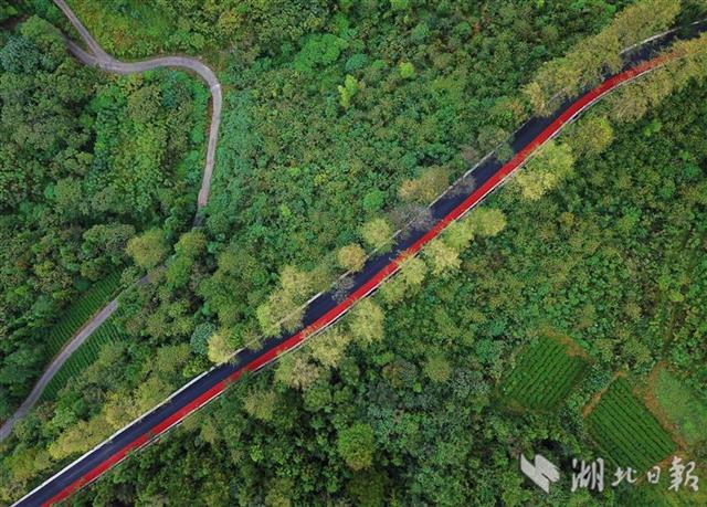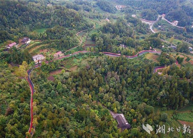 10月16日拍摄的宣恩县珠山镇封口坝蒙家湾至高罗镇板寮村的彩色旅游公路。日前,宣恩县首条盘山彩色旅游公路建成投用,公路一侧用细粒式橡胶改性彩色沥青混凝土铺装了2米宽的山地自行车赛道,宛如一条飘带缠绕山间,美丽多彩。该公路全长27.001公里,修建时有效连接九子抱母、土鱼河康养等沿线旅游景点,在为当地村民带来便捷交通的同时,也为当地旅游增添一条新动脉。(视界网王俊 罗芳艳摄)