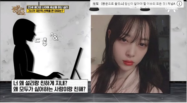 记者崔静雅(音译)表示,雪莉受到的恶评压力,比一般人想像的严重许多,其中甚至有恶评者到雪莉好友的帐号留言写下:“你为什么要跟雪莉走那么近?为什么要跟大家都讨厌的人当朋友?”得知消息的雪莉在当下立即嚎啕大哭,受到很大的伤害,随后也在节目上透露对好友的愧疚:“我的朋友那么地善良,为什么要因为我而被骂。”