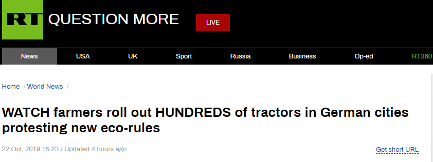 RT称,愤怒的农民将约1000辆拖拉机开进市区,堵塞主要道路及桥梁。拖拉机抗议活动也出现在其他城市,约有200人驾车经过柏林的地标建筑勃兰登堡门。