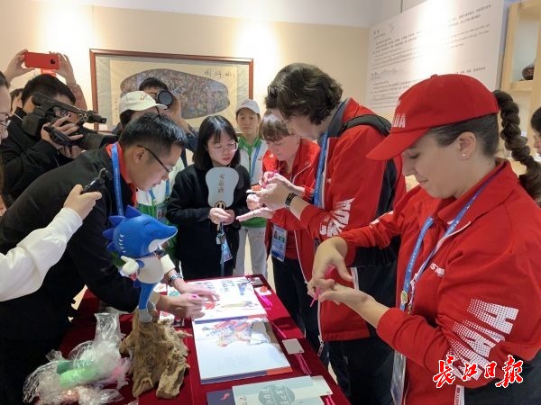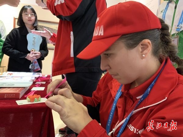 10月23日,军运村长江非遗展览馆内人头攒动,加拿大、埃及、西班牙、美国、巴西等多国代表团运动员来到武汉面塑非遗展台前,将武汉市非遗传承人、面塑艺术家刘洁团团围住,现场观摩学习武汉面塑。刘洁拿出五颜六色的面团,分发给在场运动员,手把手教他们用面团制作玫瑰花束。