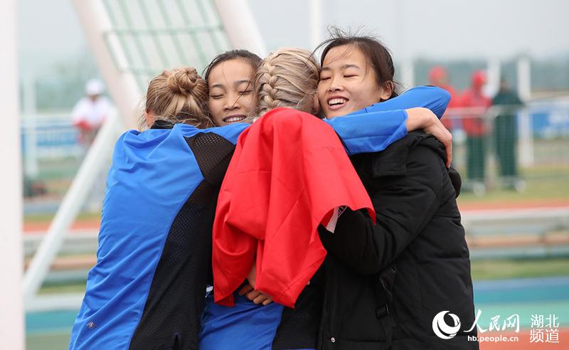 海军五项女子障碍接力金牌赛,获得冠军的中国队选手张娜(右)、谢荣华(左二)赛后和获得亚军的芬兰队选手拥抱。
