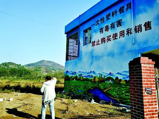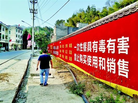 图为崇阳县港口乡村民房屋外墙的禁塑宣传