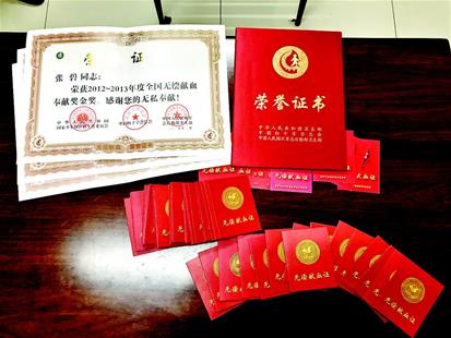 图为张碧部分献血证和获奖证书