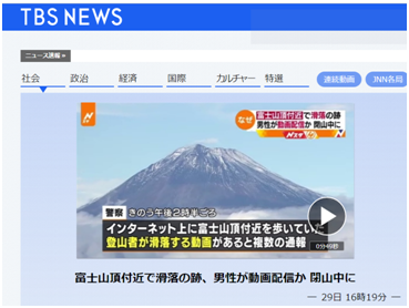 日本TBS电视台援引日本御殿场警署29日声明称,警方于28日接到一名网友报警,该网友称其“在看直播时发现一名男子从富士山顶滑落”。警方随即出动直升机前往富士山,并在山顶附近发现了有人滑落的痕迹。