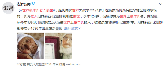 在俄罗斯阿斯特拉罕地区的阿尔恰村,长寿老人坦齐莉亚·比塞姆别耶娃去世,享年124岁,俄媒称其为世界上最年长者。据报道,从今年1月份开始她被公认为是世界上最年长的人,被收录在“俄罗斯记录簿”中。