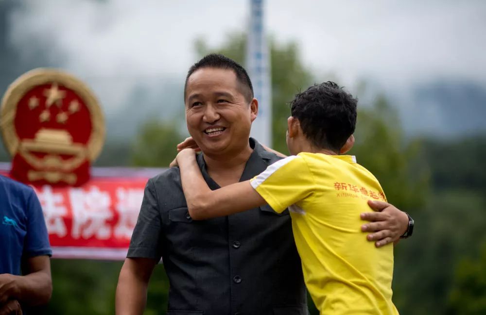 调解成功后,当事人与贡山县人民法院法官邓兴拥抱(8月30日摄)。新华社记者 江文耀 摄