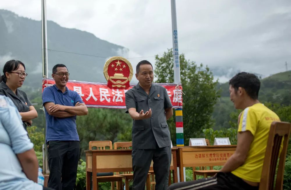 贡山县人民法院法官邓兴与同事们在丙中洛镇进行现场调解(8月30日摄)。新华社记者 江文耀 摄