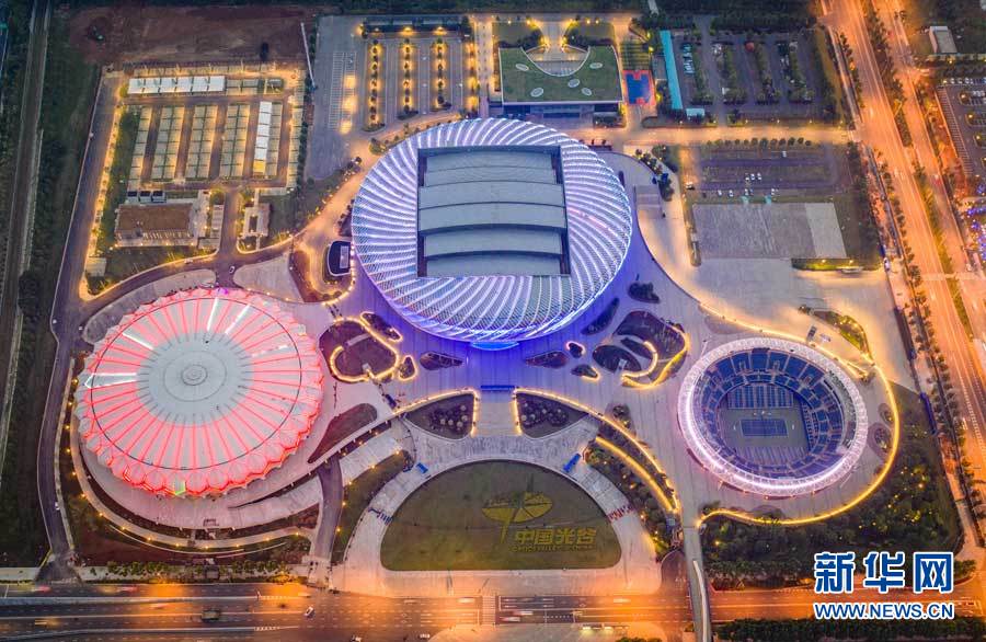 图为航拍光谷国际网球中心。精美的建筑设计在彩灯映照下美轮美奂。新华网发 赵广亮摄