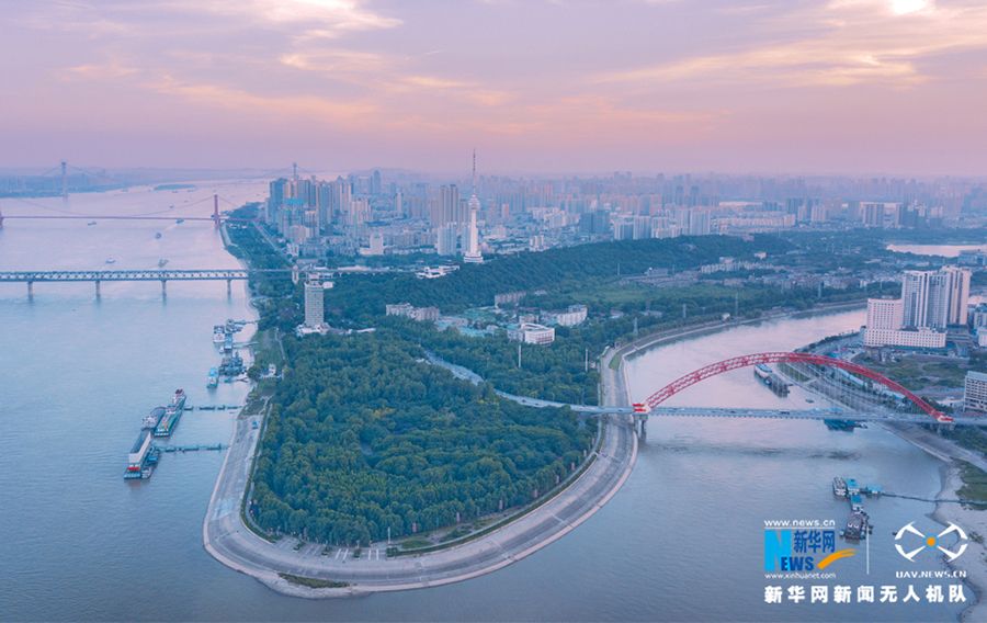 图为航拍被誉为“中国第一角”的武汉南岸嘴。多座现代桥梁横跨长江和汉江,展现建筑之美、城市之美。新华网发 欧阳小洁摄