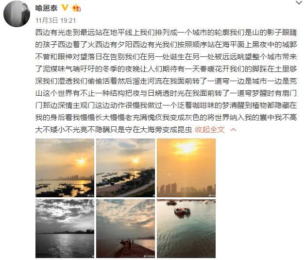 网易娱乐11月5日报道 11月3日,喻恩泰迎来了自己42岁的生日,他在社交平台上写了一首301字的长诗,并配上几张风景照片,为自己庆生。诗中写道:“西边有光,走到最远,站在地平线上,我们排列成一个城市的轮廓,我们是山的影子,眼睛的孩子,西边着了火,西边有夕阳……”结尾他写道:“我不高大,不矮小,不光亮,不隐瞒,只是守在大海旁,变成昆虫”。