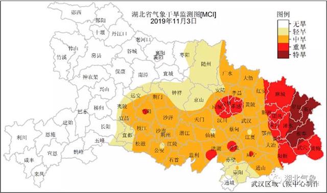 晴多雨少的天气格局使湖北省多地出现不同程度的气象干旱,虽然10月中下旬降水使中东部地区旱情有一定程度缓和,但最近10天左右的晴好天气又使旱情抬头,湖北中东部地区再度出现中等程度以上气象干旱,黄冈、黄石、孝感、荆州东部等地出现重度以上气象干旱。